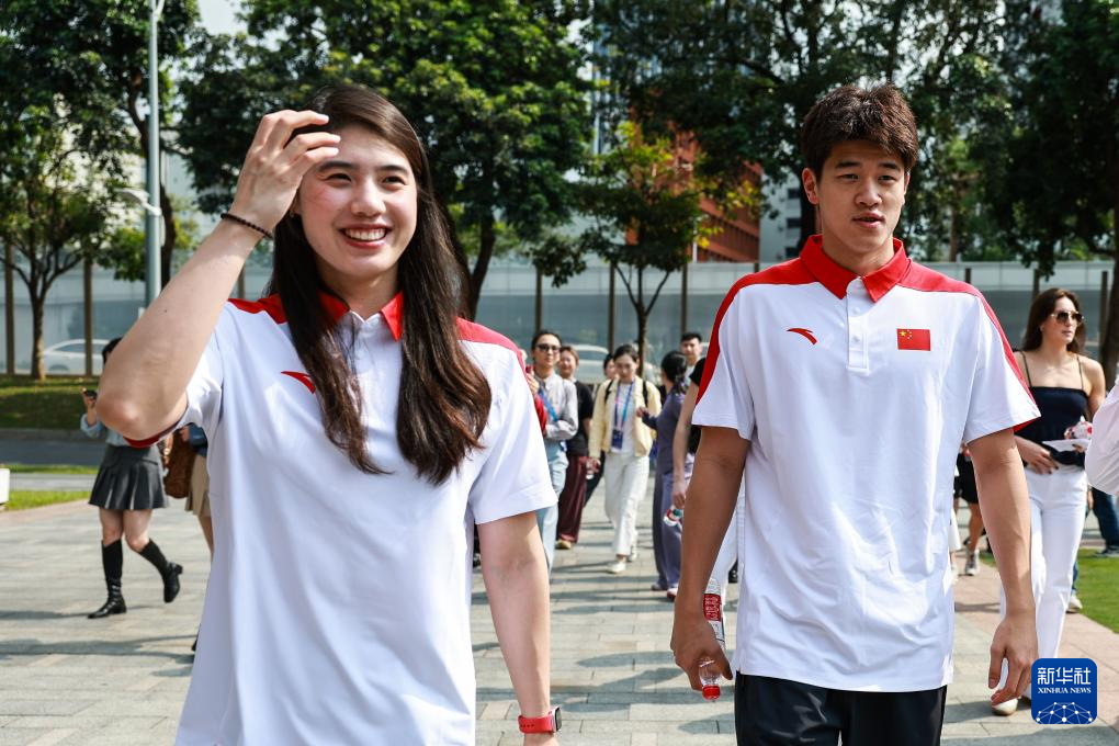 3月18日,中国游泳运动员张雨霏(左)、潘展乐参加校园公益活动。