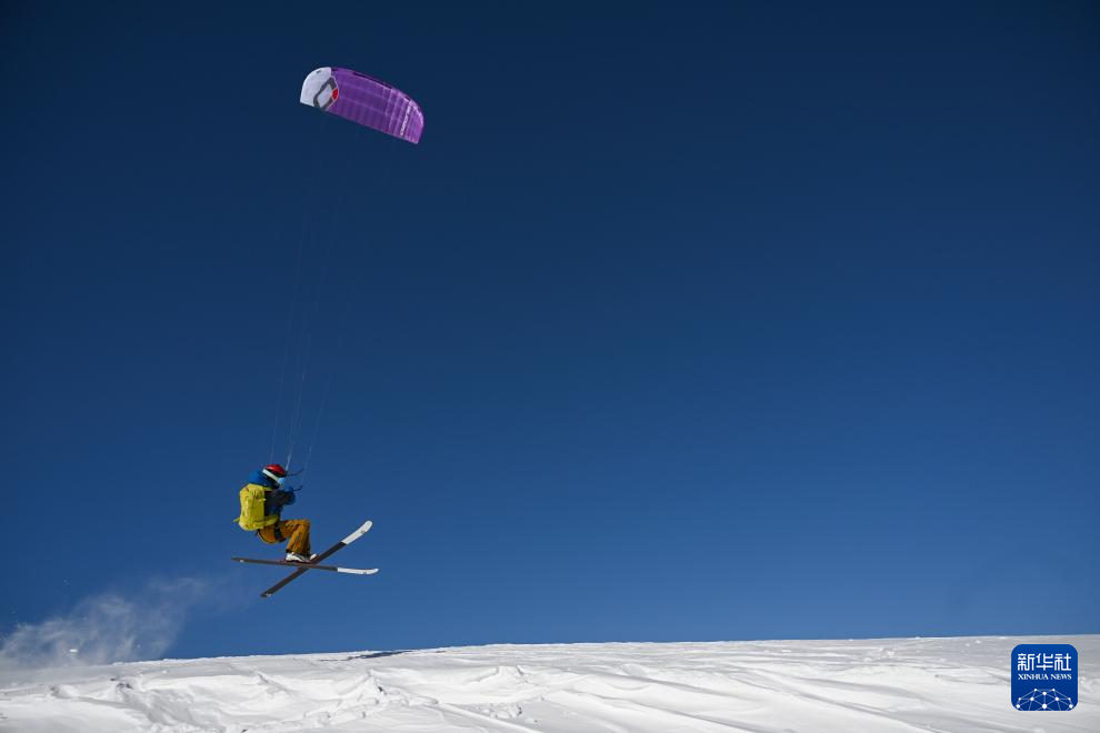 在新疆伊犁河谷东部山区,程鹏在滑行中借助风筝腾空跳跃(3月14日摄)。