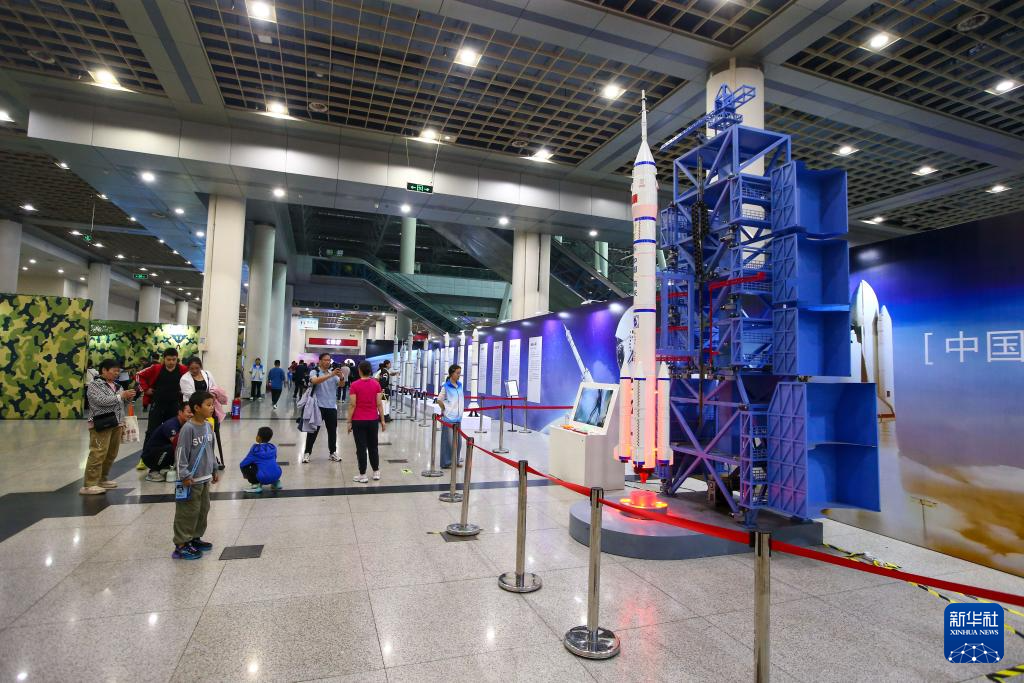 10月3日,在山东济南市舜耕国际会展中心,市民在参观航空航天科普展。