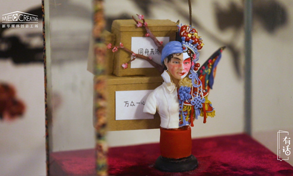 面塑俗稱面人,因為它主要的題材都是人物,所以老百姓們也管它叫面人。這個是“三八婦女節(jié)”那天做的,我看到當(dāng)時有很多的醫(yī)護人員作為人類的代表跟另外一個物種去斗爭、保護我們,覺得她們還真的是很了不起的。想到以前巾幗英雄里邊穆桂英這個角色,加上京劇也是我們傳統(tǒng)文化中很寶貴的一個部分,就把這兩個結(jié)合在一起做了一個拼臉。