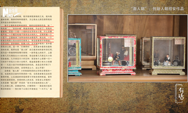 冰心先生的《小桔燈》散文集中,有一篇叫作《“面人郎”訪問記》的文章:“架子上擺的真是琳瑯滿目,他的比較新的作品,如“雞毛信”,“采茶撲蝶”等逼真細(xì)膩,不必說了;而我所最愛的,還是一小組一小組的舊北京街頭小景,什么賣糖葫蘆的,一個戴灰呢帽子穿黑色長袍的人,左臂挎著一個小籃子,上面插滿了各種各樣的冰糖葫蘆;剃頭的,一個披著白布的人低頭坐在紅板凳上,旁邊放著架子和銅盆;賣茶湯的;賣砂鍋的;吹糖人的;無不惟妙惟肖!”在文章當(dāng)中,冰心先生也提到了,最令她心動的是一個打糖鑼的,這是她童年最喜歡、最熟悉的東西,她認(rèn)為這也是“面人郎”最深刻的童年回憶。