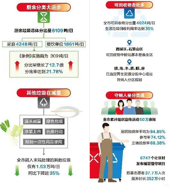 ??? 《北京市生活垃圾管理?xiàng)l例》已滿8個(gè)月,北京市城市管理委員會(huì)交出的“成績(jī)單”顯示,家庭廚余分出率、垃圾減量率等重要指標(biāo)快速提升,市民踐行垃圾分類新時(shí)尚的自覺(jué)已初步養(yǎng)成。