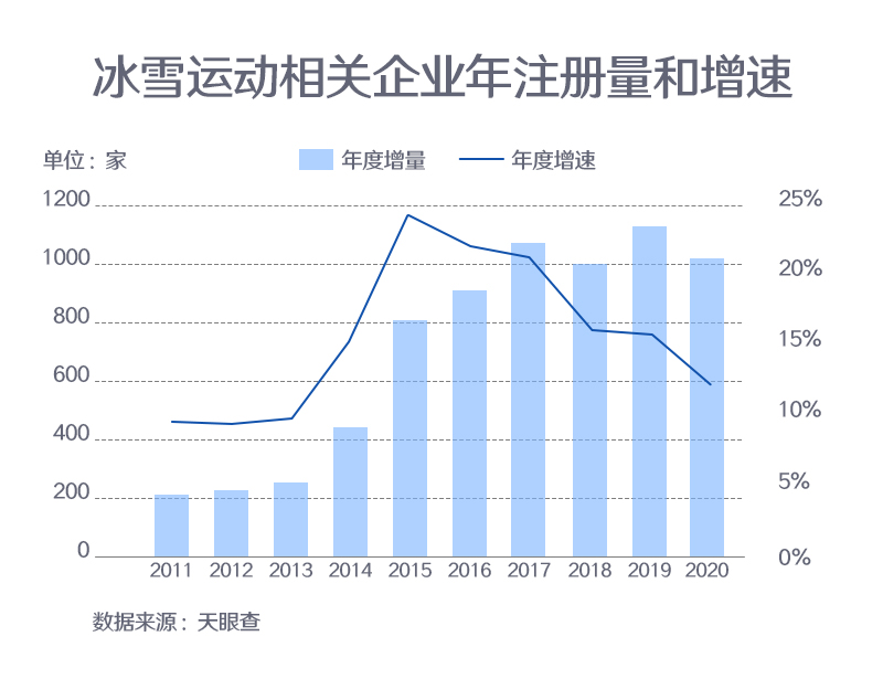 ??? 資料顯示,2015年7月31日,北京獲得2022年冬奧會舉辦權(quán)。同年,天眼查專業(yè)版數(shù)據(jù)顯示,冰雪運動相關(guān)企業(yè)年度注冊增速達到了歷史峰值(全部企業(yè)狀態(tài)),為24.4%。此后的幾年,冰雪運動相關(guān)企業(yè)總量仍呈上漲態(tài)勢。以工商登記為準,2020年我國共新增超過1,000家冰雪運動相關(guān)企業(yè)。