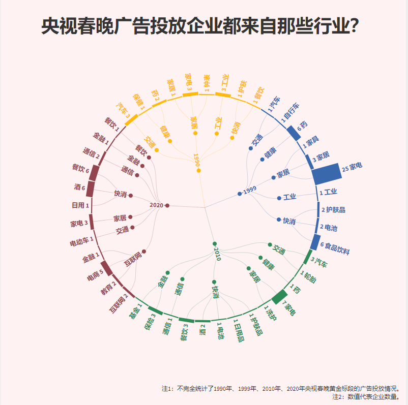 據(jù)記者不完全統(tǒng)計(jì),在春晚開播前的黃金標(biāo)段,1990年共有16條廣告,涉及的行業(yè)多為工業(yè)、汽車、家電等行業(yè)。1999年,春晚廣告數(shù)量增加至48條,其中家電行業(yè)的廣告最多,足足有25條,包括VCD、電視、空調(diào)、家庭影院、冰箱、家用電腦等。2010年廣告數(shù)量?jī)H為26條,快消和家電行業(yè)的廣告數(shù)量不相上下,通信和金融也出現(xiàn)在這一年的廣告中,成為“新秀”。2020年,廣告數(shù)量為31條,家電的廣告不再常見,快消和互聯(lián)網(wǎng)行業(yè)的各占了三分之一。