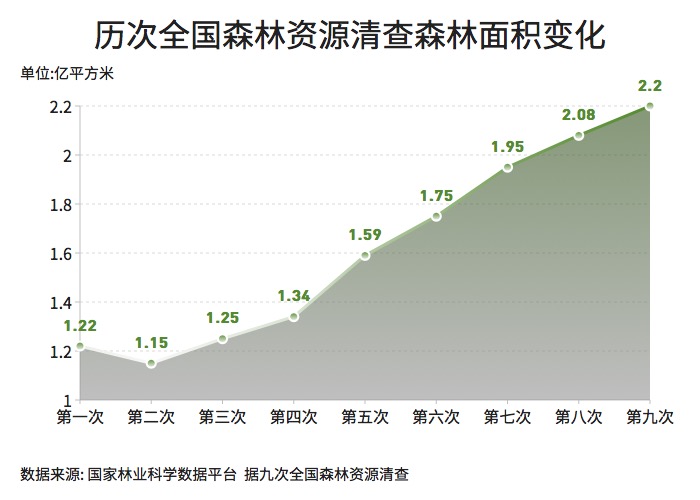 ??? 根據(jù)國家林業(yè)和草原局統(tǒng)計,目前全國森林面積達到2.2億公頃,森林覆蓋率23.04%?;赝糯稳珖仲Y源清查結果可以看出,我國的森林覆蓋率逐年穩(wěn)步提高。還有一些監(jiān)測數(shù)據(jù)顯示,近20年來中國新增植被覆蓋面積約占全球新增總量的25%,居全球首位。