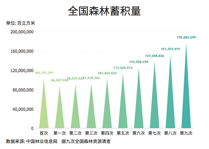 ??? 森林蓄積量是反映一個國家或地區(qū)森林資源總規(guī)模和水平的基本指標之一,也是反映森林資源的豐富程度、衡量森林生態(tài)環(huán)境優(yōu)劣的重要依據(jù)?!笆濉逼陂g,我國森林蓄積量超過175.6億立方米,森林植被碳儲量91.86億噸。