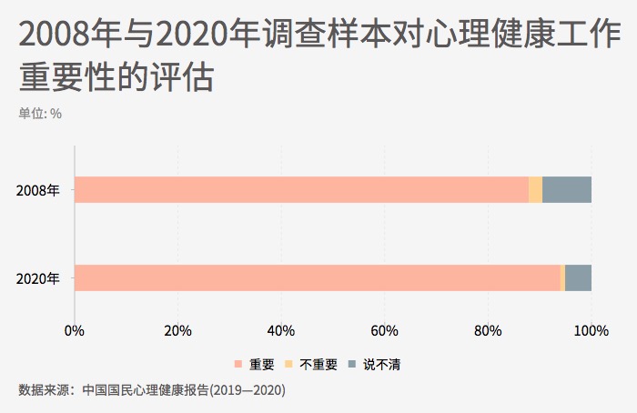 ??? 心理健康意識(shí)體現(xiàn)為認(rèn)識(shí)到心理健康工作的重要性。對(duì)于心理健康工作重要性的評(píng)估,2020年調(diào)查中,有94.0%的調(diào)查對(duì)象認(rèn)為心理健康工作是重要的。與2008年相比,2020年調(diào)查中,有更多的人認(rèn)為心理健康工作重要,比12年前提高了6.1個(gè)百分點(diǎn),說(shuō)明人們的心理健康意識(shí)有所增強(qiáng)。