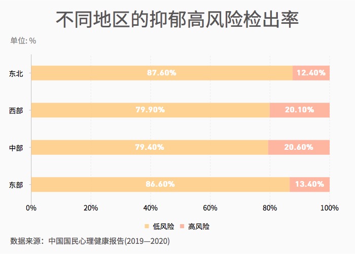 ??? 心理健康狀況受到地區(qū)經(jīng)濟(jì)發(fā)展、教育水平、醫(yī)療條件等諸多宏觀因素的影響,因此通常與這些宏觀因素一樣表現(xiàn)出地區(qū)差異。2020年度調(diào)查發(fā)現(xiàn),東部地區(qū)的總體心理健康水平更好。東部地區(qū)與東北地區(qū)的抑郁水平顯著低于中部和西部地區(qū),抑郁高風(fēng)險(xiǎn)的檢出率顯著低于中部和西部地區(qū)。