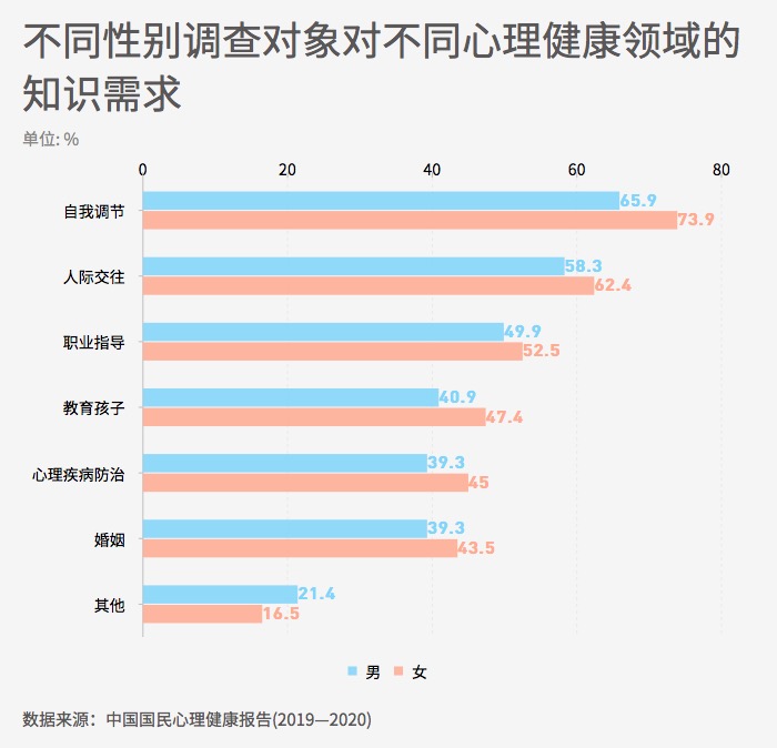 ??? 2020年調(diào)查詢問(wèn)人們需要哪些方面的心理健康知識(shí),并分析不同群體的需求特征。數(shù)據(jù)顯示,“自我調(diào)節(jié)”、“人際交往”、“職業(yè)指導(dǎo)”位列選擇的前三。另外,女性在各項(xiàng)心理健康知識(shí)的需求上的選中率均高于男性,提示著女性對(duì)心理健康知識(shí)有更主動(dòng)和迫切的需求。