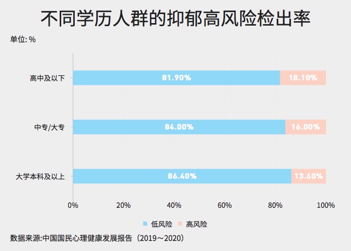 ??? 根據(jù)報(bào)告分析結(jié)果顯示,不同學(xué)歷組間差異顯著。學(xué)歷越高,心理健康水平越高,特別是大學(xué)本科及以上學(xué)歷人群的心理健康水平顯著高于更低學(xué)歷的人群。以抑郁為例,可以看到大學(xué)本科及以上學(xué)歷組的抑郁高風(fēng)險(xiǎn)檢出率較低。