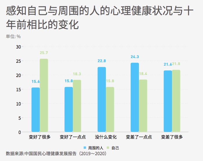 ??? 十年變遷感知調(diào)查對(duì)象認(rèn)為,與十年前相比,周?chē)娜说男睦斫】禒顩r變好(“變好了很多”和“變好了一點(diǎn)點(diǎn)”)的比例為31.4%,認(rèn)為“沒(méi)什么變化”的占22.8%,認(rèn)為變差(“變差了一點(diǎn)點(diǎn)”和“變差了很多”)的占45.9%。總的來(lái)說(shuō),人們?cè)诳创磉吽藸顩r的時(shí)候,認(rèn)為總體心理健康水平比十年前有所下降。