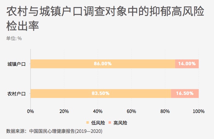 ??? 國(guó)內(nèi)外研究普遍發(fā)現(xiàn),社會(huì)經(jīng)濟(jì)地位通常與心理健康水平呈正相關(guān)。較高的收入水平、較高的學(xué)歷、聲望較好的職業(yè),往往意味著擁有包括心理健康資源在內(nèi)的各種資源支持,有助于維護(hù)更高的心理健康水平。研究也發(fā)現(xiàn),農(nóng)村戶口人群與城鎮(zhèn)戶口人群之間存在心理健康水平差異。調(diào)查中發(fā)現(xiàn)農(nóng)村戶口人群中抑郁高風(fēng)險(xiǎn)的檢出率略高于城鎮(zhèn)戶口人群。