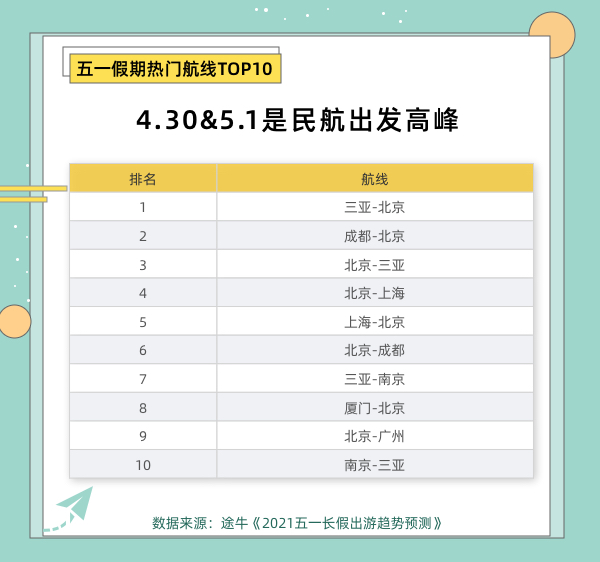 ????? 根據(jù)途牛發(fā)布的《2021五一長(zhǎng)假出游趨勢(shì)預(yù)測(cè)》數(shù)據(jù),在旅游快速?gòu)?fù)蘇、“加長(zhǎng)版”假期、旅游優(yōu)惠活動(dòng)等多重利好下,今年“五一”計(jì)劃出游的人數(shù)將暴增。出行人數(shù)的激增使多條熱門(mén)航線票價(jià)大漲,4月30日和5月1日兩天是民航出發(fā)最高峰,而返程高峰將出現(xiàn)在5月4日、5日的假期末尾。