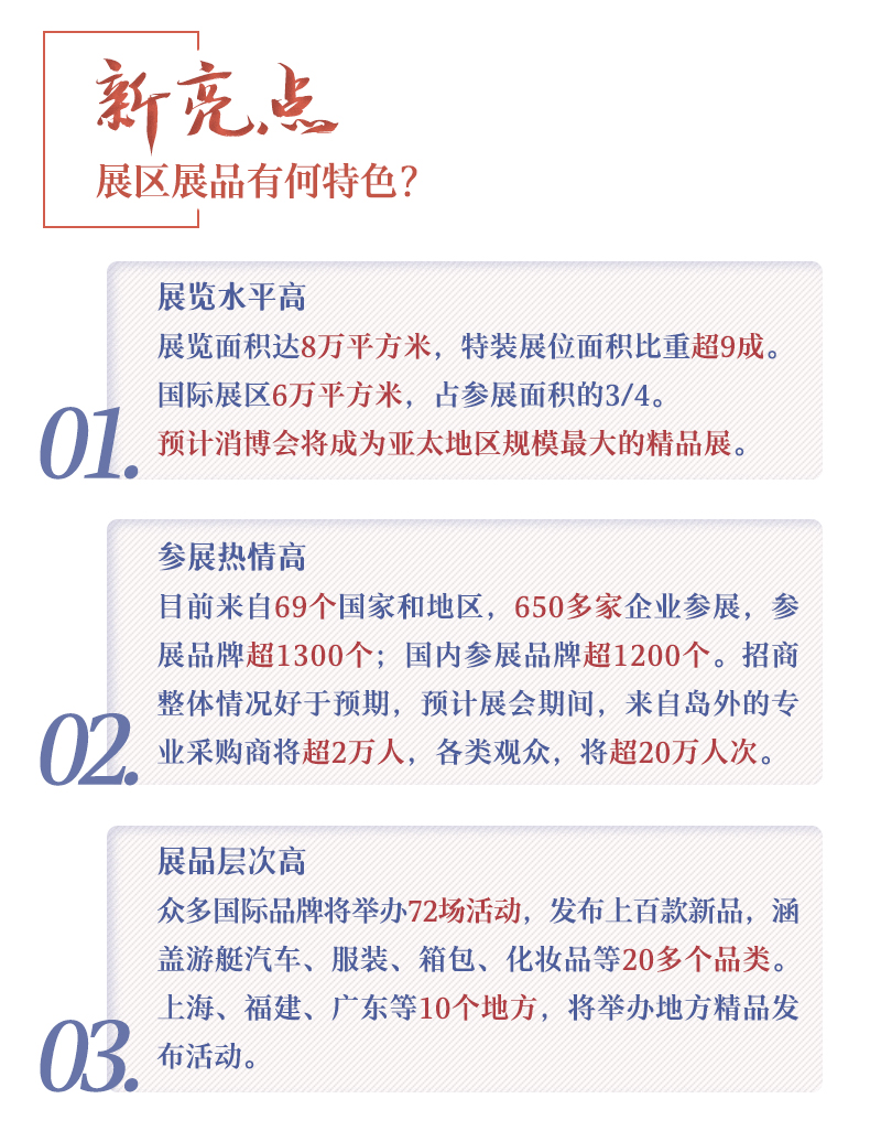 ??? 本屆中國國際消費(fèi)品博覽會規(guī)模盛大,立志于打造亞太地區(qū)規(guī)模最大的精品展??涨暗囊?guī)模吸引了來自69個國家和地區(qū)的650多家企業(yè)參展,參展品牌超1300個,其中國內(nèi)參展品牌超1200個。從服飾箱包到美妝精品,從珠寶鉆石到游艇汽車,將有上百款消費(fèi)精品首發(fā)首秀。