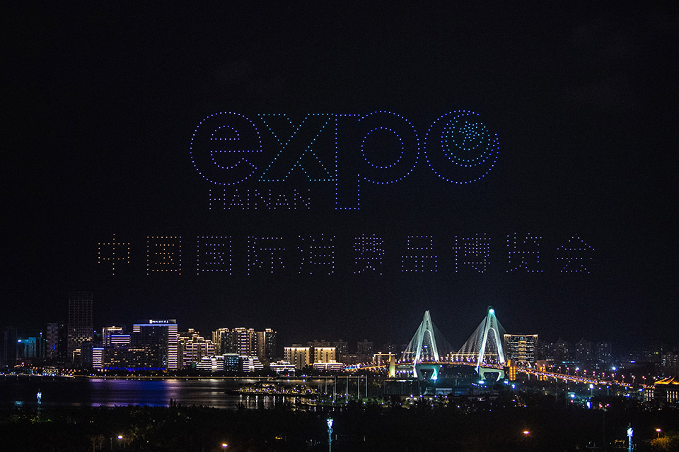 ??? 首屆中國國際消費(fèi)品博覽會于5月7日至10日在位于??诘暮D蠂H會展中心舉辦。5月6日晚,??谑猩涎轃o人機(jī)表演秀,迎接首屆消博會的舉辦。新華社記者 蒲曉旭 攝
