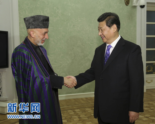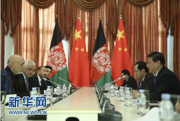 ????習近平指出,2014年之后,阿富汗的命運將更加緊密地同地區(qū)國家聯(lián)系在一起。中方支持阿富汗融入地區(qū)經(jīng)濟合作。中方將于8月舉辦阿富汗問題伊斯坦布爾進程第四次外長會,我們愿同阿方密切合作,辦好這次會議。中方也愿推動上海合作組織在阿富汗問題上發(fā)揮更大作用。