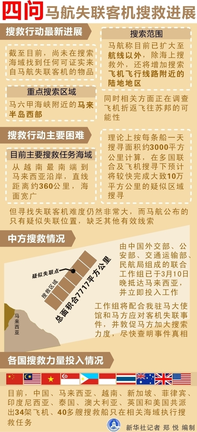 ????馬來西亞方面11日表示,截至目前,尚未在搜索海域找到任何可以證實來自馬航失聯(lián)客機的物品。馬航稱,目前搜救小組已將搜索范圍擴大至航線以外,除海上搜救外,還將增加搜索飛機飛行線路附近的陸地地區(qū)。重點搜索區(qū)域為馬六甲海峽附近的馬來半島西部。同時,相關方面正在調查飛機折返飛往蘇邦的可能性。