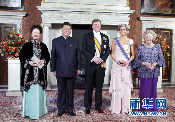 ??? 3月22日,國(guó)家主席習(xí)近平在阿姆斯特丹會(huì)見荷蘭國(guó)王威廉-亞歷山大。當(dāng)晚,威廉-亞歷山大國(guó)王在王宮為習(xí)近平舉行盛大國(guó)宴。威廉-亞歷山大國(guó)王、馬克西瑪王后、貝婭特麗克絲前女王共同迎接習(xí)近平和夫人彭麗媛到來。新華社記者鞠鵬攝