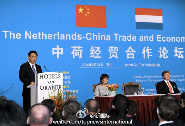 ????新華網(wǎng)北京3月24日電 據(jù)新華社“新國(guó)際”微博報(bào)道, 習(xí)近平主席出席中荷經(jīng)貿(mào)合作論壇開幕式,暢談豐碩合作成果。他還說:“荷蘭足球隊(duì)被稱為世界足球的‘無(wú)冕之王’。荷蘭是‘歐洲菜籃子’和‘郁金香王國(guó)’?!绷?xí)近平這番話博得滿場(chǎng)掌聲和笑聲。