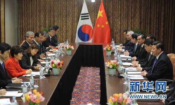 ????兩國元首還就朝鮮半島形勢交換意見。習近平指出,中韓在半島問題上有著共同的利益和關切。雙方都致力于實現半島無核化,都希望半島保持和平穩(wěn)定,都堅持通過和平方式解決問題,雙方開展協調合作契合點很多。今年以來,半島形勢總體保持緩和勢頭,南北關系得到一定改善。中方積極評價樸槿惠總統提出的“半島信任進程”,希望南北雙方著眼長遠,保持耐心和定力,不斷推進和解合作進程,最終實現自主和平統一。朝核問題錯綜復雜,需要綜合施策。各方應該抓住半島形勢相對緩和的契機,爭取早日重啟六方會談。