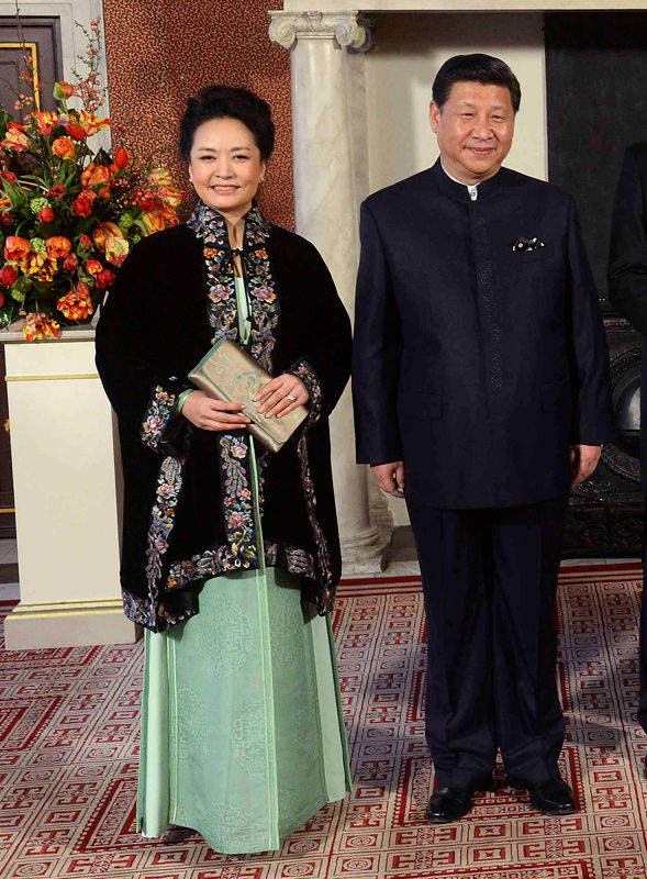 ——在出席威廉-亞歷山大國王舉行的國宴時,習主席與夫人彭麗媛都以中式服裝亮相。習主席穿著的中式服裝色彩飽和,略帶暗光澤,頗具莊嚴感;高密度高支紗的面料讓人感覺嚴謹與厚重;在設計上,暗門襟的設計將前胸的紐扣都隱藏起來,沉穩(wěn)大氣,淡去人們對于中山裝的記憶。頗具巧思的是左前胸呼應西裝口袋巾的圖案設計,體現出對西方禮儀的尊重,也營造出輕松和諧的氛圍。彭麗媛穿著的是牡丹花刺繡的外套,內搭粉果綠的長裙,長裙很具有清新感,內藏著對綠色環(huán)保的崇尚。中國刺繡素來被西方人所崇尚,牡丹花自古被視為中國的國花,頗具傳統(tǒng)風格的粉果綠色彩,給人以清新感,同時內藏對綠色環(huán)保的崇尚。整套服裝具有很鮮明的中國特色,非常符合中國人的審美觀,又符合西方時尚,并且廓形感很強。