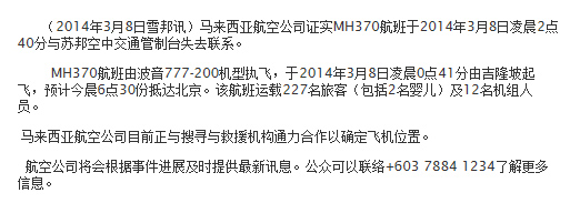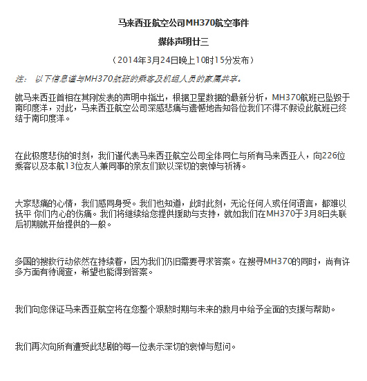 ????馬航官方網(wǎng)站上的《媒體聲明廿三》表示,“在此極度悲傷的時刻,我們謹代表馬來西亞航空公司全體同仁與所有馬來西亞人,向226位乘客以及本航13位友人兼同事的親友們致以深切的哀悼與祈禱?!?/p>