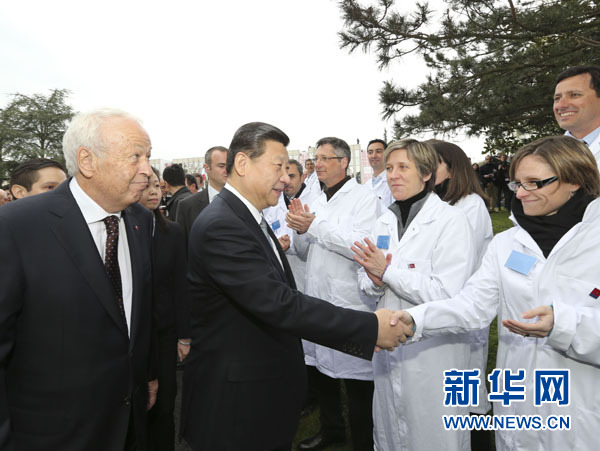 習(xí)近平和夫人彭麗媛抵達(dá)時(shí),梅里埃集團(tuán)總裁阿蘭·梅里埃率家族成員以及該中心員工列隊(duì)熱烈歡迎。法國(guó)政府外長(zhǎng)法比尤斯、高教部長(zhǎng)菲奧拉索陪同參觀(guān)。
