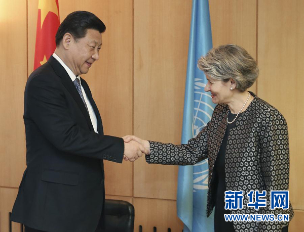 ????3月27日,國家主席習(xí)近平在巴黎聯(lián)合國教科文組織總部會(huì)見該組織總干事博科娃。新華社記者 姚大偉 攝