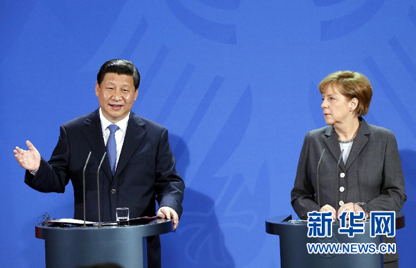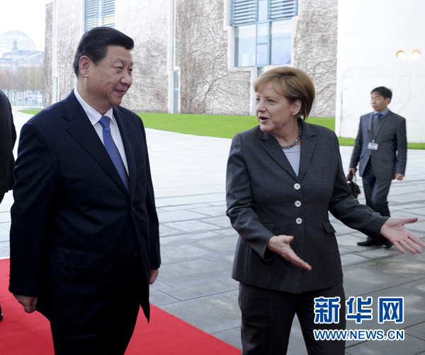 ????兩國領(lǐng)導(dǎo)人還共同會見了記者。習(xí)近平指出,中德關(guān)系發(fā)展到今天,兩國務(wù)實合作的效應(yīng)不再是簡單的一加一等于二,而是遠(yuǎn)遠(yuǎn)大于二。深化中德合作,利在兩國,惠及歐洲和世界。我這次訪問期間,雙方?jīng)Q定將兩國關(guān)系提升為全方位戰(zhàn)略伙伴關(guān)系,并簽署了多項合作協(xié)議。中德關(guān)系站在新起點上,面臨新的發(fā)展機遇。相信到2020年,歐洲的德國和亞洲的中國,經(jīng)濟實力將更強大,互利合作將更緊密,在國際事務(wù)中的影響將進(jìn)一步提高。