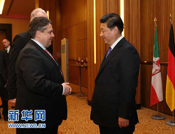 ??? 3月29日,國(guó)家主席習(xí)近平在杜塞爾多夫會(huì)見德國(guó)副總理兼經(jīng)濟(jì)和能源部長(zhǎng)、德國(guó)社會(huì)民主黨主席加布里爾。 新華社記者劉衛(wèi)兵攝