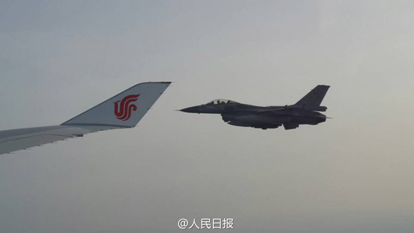 ????當習近平乘坐的專機進入比利時領(lǐng)空時,比利時皇家空軍兩架戰(zhàn)機升空護航。(圖片來源:《人民日報》法人微博)