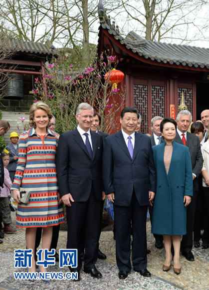 ????習(xí)近平和夫人彭麗媛抵達(dá)時(shí),受到菲利普國王和瑪?shù)贍柕峦鹾蟆⒈壤麜r(shí)首相迪呂波熱情迎接。兩國領(lǐng)導(dǎo)人一同步入中國園。亭臺樓閣、雕梁畫棟、鳥語花香,這里宛如一幅恬靜祥和的中華寫意畫。兩國元首夫婦沿著回廊曲徑,穿過青翠竹林,前往大熊貓園。他們邊走邊談,回顧中比兩國友好交往。
