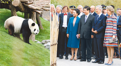 習(xí)近平和夫人彭麗媛抵達(dá)時,受到菲利普國王和瑪?shù)贍柕峦鹾?、比利時首相迪呂波熱情迎接。兩國領(lǐng)導(dǎo)人一同步入中國園。亭臺樓閣、雕梁畫棟、鳥語花香,這里宛如一幅恬靜祥和的中華寫意畫。兩國元首夫婦沿著回廊曲徑,穿過青翠竹林,前往大熊貓園。他們邊走邊談,回顧中比兩國友好交往。