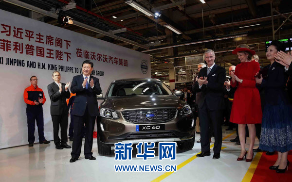 ????4月1日,國家主席習(xí)近平在比利時國王菲利普陪同下參觀沃爾沃汽車公司根特工廠。這這是習(xí)近平和菲利普國王共同為公司出口中國的第30萬輛汽車揭幕。 新華社記者 姚大偉 攝