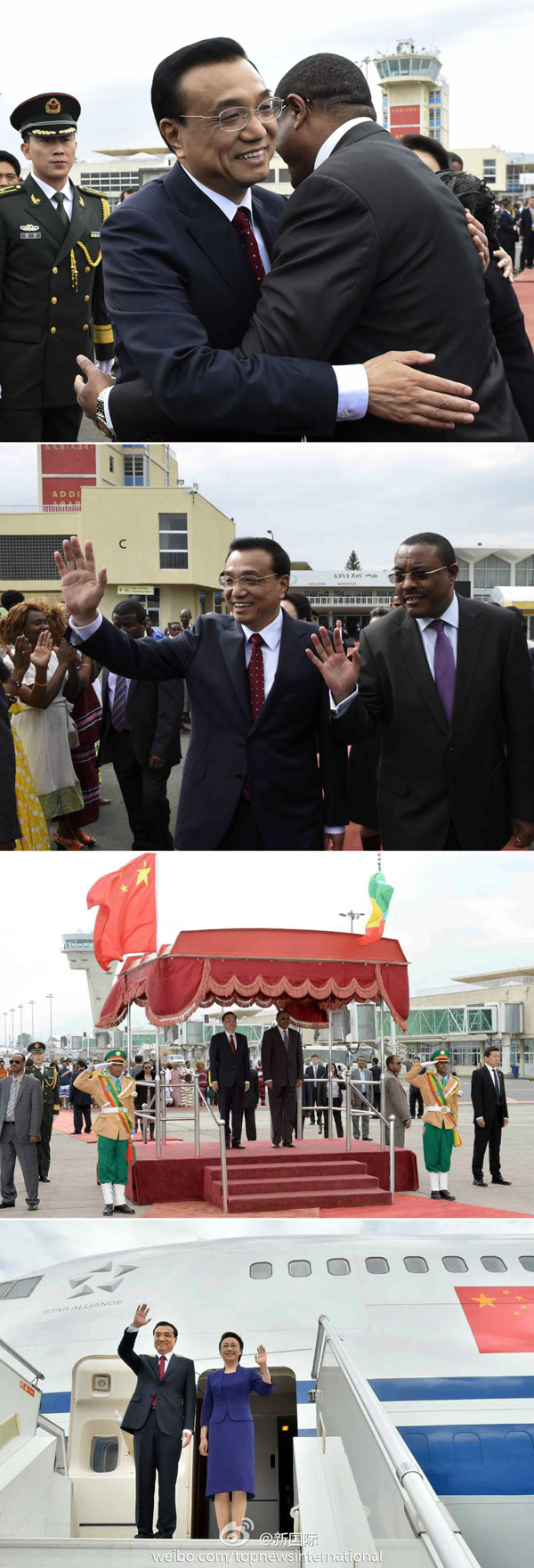新華網(wǎng)北京5月7日電? 據(jù)新華社“新國(guó)際”微博報(bào)道,?當(dāng)?shù)貢r(shí)間6日下午,李克強(qiáng)總理結(jié)束對(duì)埃塞俄比亞和非盟總部的訪問(wèn),乘專機(jī)離開亞的斯亞貝巴飛赴此訪非洲的第二站尼日利亞。埃塞總理海爾馬里亞姆和夫人到機(jī)場(chǎng)歡送,并舉行了歡送儀式。身著民族服裝的當(dāng)?shù)孛癖娸d歌載舞歡送中國(guó)貴賓。