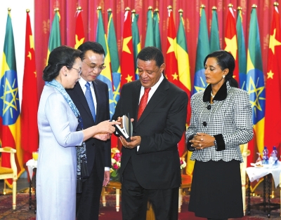 ▲李克強總理與夫人程虹當?shù)貢r間6日上午同埃塞總統(tǒng)穆拉圖夫婦在國家宮會見。會見后,程虹將自己的著作和譯著贈送給姆拉圖總統(tǒng)夫婦。圖/中國政府網(wǎng)