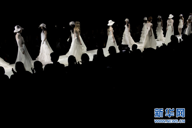 模特在T臺上展示西班牙女服裝設計師 Inmaculada Garcia的婚紗作品。Inmaculada Garcia同時也是來自巴塞羅那當?shù)氐囊粋€婚紗品牌。