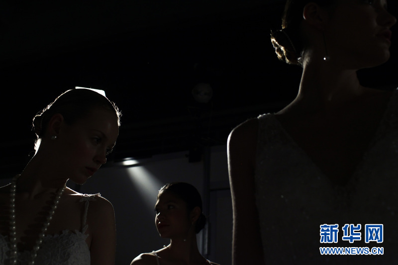 場(chǎng)外正在準(zhǔn)備登臺(tái)展示婚紗的模特。