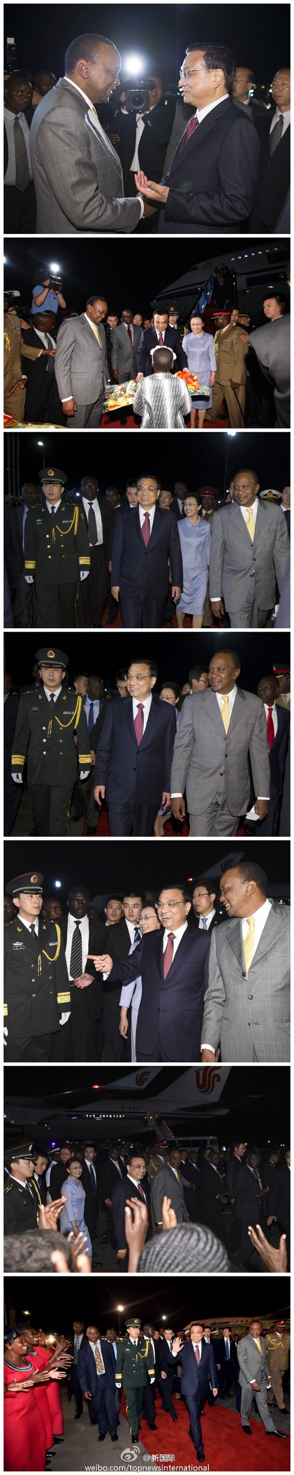????新華網(wǎng)北京5月10日電? 據(jù)新華社“新國際”微博報道,李克強總理9日晚乘專機抵達內(nèi)羅畢,肯尼亞總統(tǒng)肯雅塔和副總統(tǒng)魯托率肯政府高級官員到機場迎接,當?shù)孛癖娨允⒋蟮奶厣褡甯栉瑁瑲g迎中國貴賓到來。