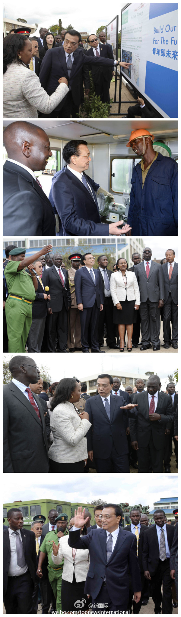 ????新華網(wǎng)北京5月11日電 據(jù)新華社“新國際”微博報道,李克強(qiáng)總理11日在肯副總統(tǒng)魯托陪同下到國家青年服務(wù)隊參觀。這里供學(xué)員實(shí)習(xí)的鉆井、起重、消防等裝備不少來自中國。李克強(qiáng)攀上一輛移動維修車查看并詢問維護(hù)等服務(wù)情況。他說,要用好中國裝備和技術(shù)優(yōu)勢,幫助非洲青年提升職業(yè)技能,促進(jìn)當(dāng)?shù)鼐蜆I(yè)。?