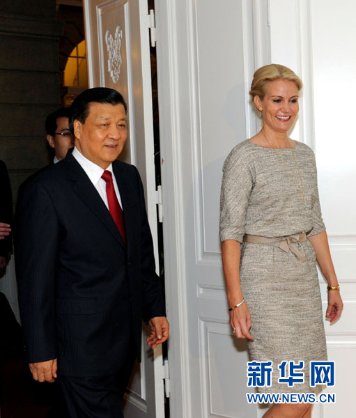 ??? 6月11日,正在丹麥進(jìn)行正式訪問的中共中央政治局常委、中央書記處書記劉云山在哥本哈根會(huì)見丹麥?zhǔn)紫?、社民黨主席托寧-施密特。 新華社記者饒愛民 攝