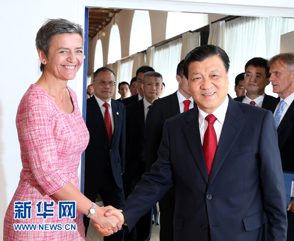 ??? 6月11日,正在丹麥進(jìn)行正式訪問的中共中央政治局常委、中央書記處書記劉云山在哥本哈根會(huì)見丹麥經(jīng)濟(jì)內(nèi)政大臣瑪格麗特·韋斯塔格。新華社記者姚大偉攝