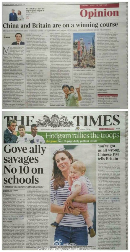 ????新華網(wǎng)北京6月17日電 據(jù)新華社“新國際”微博報(bào)道,訪英前夕,李克強(qiáng)總理16日在英國主流媒體《泰晤士報(bào)》發(fā)表題為“中英正走在共贏的道路上”的署名文章。對此,該報(bào)同日在頭版配發(fā)文章稱,李克強(qiáng)的文章標(biāo)志著一場“展示真正中國的運(yùn)動(dòng)”已開始,中國作為世界重要國家,將為維護(hù)和平與合作作出積極貢獻(xiàn)。?