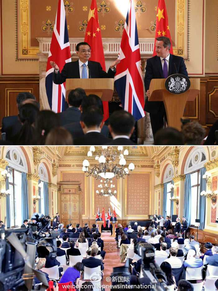 ???? 新華網(wǎng)北京6月18日電 據(jù)新華社“新國(guó)際”微博報(bào)道,17日李克強(qiáng)與卡梅倫共見記者時(shí)說(shuō),今天陽(yáng)光明媚是個(gè)好日子,英國(guó)有句諺語(yǔ):把握一個(gè)今天,勝似兩個(gè)明天。中國(guó)也常說(shuō)“時(shí)不我待”。中英合作基礎(chǔ)好、潛力大,雙方有責(zé)任搶抓機(jī)遇,規(guī)劃新路線,鋪設(shè)快車道,使兩國(guó)關(guān)系明天更加燦爛。