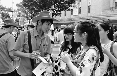 圖為中文旅游咨詢員李潤雨(左二)正在熱心地為中國游客指路。本報(bào)記者 萬宇攝