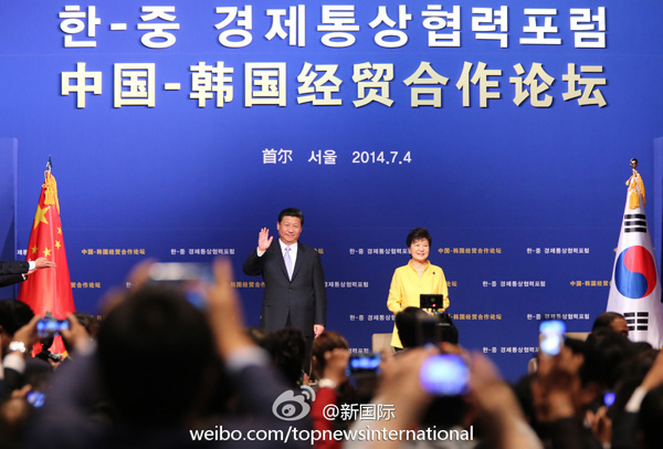 新華網(wǎng)北京7月4日電 據(jù)新華社“新國(guó)際”微博報(bào)道,習(xí)近平表示,中韓應(yīng)共同反對(duì)保護(hù)主義,兩國(guó)企業(yè)可以在制定國(guó)際標(biāo)準(zhǔn)、開(kāi)拓國(guó)際市場(chǎng)、參與區(qū)域一體化進(jìn)程等方面加強(qiáng)探討、拓展合作。中方歡迎韓國(guó)參與亞洲基礎(chǔ)設(shè)施投資銀行籌建,共同推動(dòng)地區(qū)互聯(lián)互通和基礎(chǔ)設(shè)施建設(shè)。