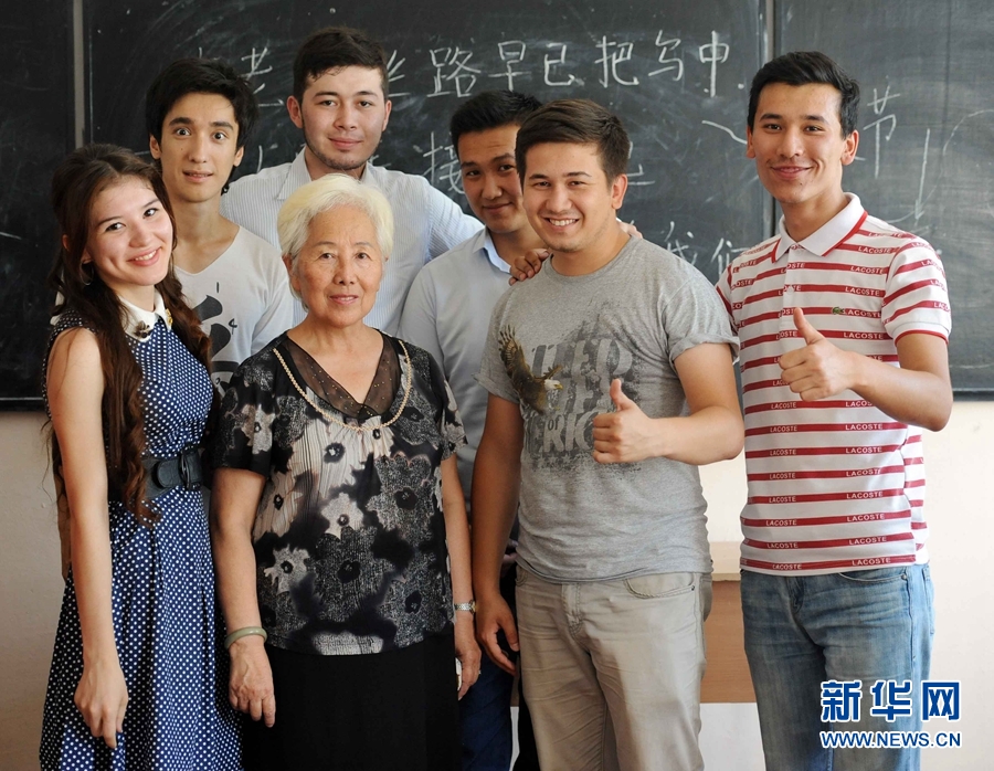 ??? 6月25日,烏茲別克斯坦首都塔什干,烏國立世界語言大學教室,70歲的董富華在向三年級學生上漢語課。新華網(wǎng)記者 沙達提攝。