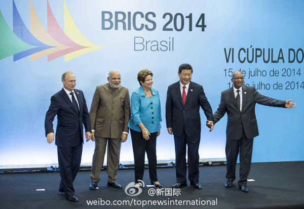 ???? 新華網(wǎng)北京7月16日電 據(jù)新華社“新國際”微博報道,習近平在出席金磚國家領(lǐng)導(dǎo)人第六次會晤時提出,要發(fā)揚金磚國家獨特的“開放、包容、合作、共贏”的合作伙伴精神,要堅定不移推動經(jīng)濟可持續(xù)增長,堅定不移形成全方位經(jīng)濟合作,堅定不移塑造有利外部發(fā)展環(huán)境,堅定不移提高道義感召力。