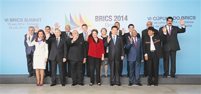 本報巴西利亞7月16日電 (記者杜尚澤、丁剛)7月16日,金磚國家同南美國家領導人對話會在巴西利亞舉行。中國國家主席習近平、巴西總統羅塞夫、俄羅斯總統普京、印度總理莫迪、南非總統祖馬以及蘇里南總統鮑特塞、阿根廷總統克里斯蒂娜、玻利維亞總統莫拉萊斯、哥倫比亞總統桑托斯、智利總統巴切萊特、厄瓜多爾總統科雷亞、圭亞那總統拉莫塔爾、巴拉圭總統卡特斯、秘魯總統烏馬拉、烏拉圭總統穆???、委內瑞拉總統馬杜羅等南美國家領導人共同出席。