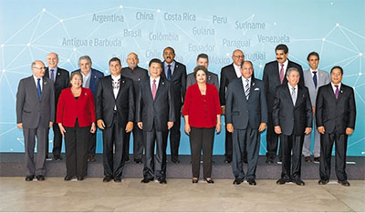? 當?shù)貢r間7月17日下午,中國—拉美和加勒比國家領(lǐng)導人會晤在巴西利亞舉行。本次會晤由中方倡議,中國國家主席習近平、巴西總統(tǒng)羅塞夫、哥斯達黎加總統(tǒng)索利斯、古巴國務(wù)委員會主席兼部長會議主席勞爾·卡斯特羅、厄瓜多爾總統(tǒng)科雷亞、蘇里南總統(tǒng)鮑特塞、哥倫比亞總統(tǒng)桑托斯、智利總統(tǒng)巴切萊特、圭亞那總統(tǒng)拉莫塔爾、烏拉圭總統(tǒng)穆??ā⑽瘍?nèi)瑞拉總統(tǒng)馬杜羅、安提瓜和巴布達總理布朗等出席。